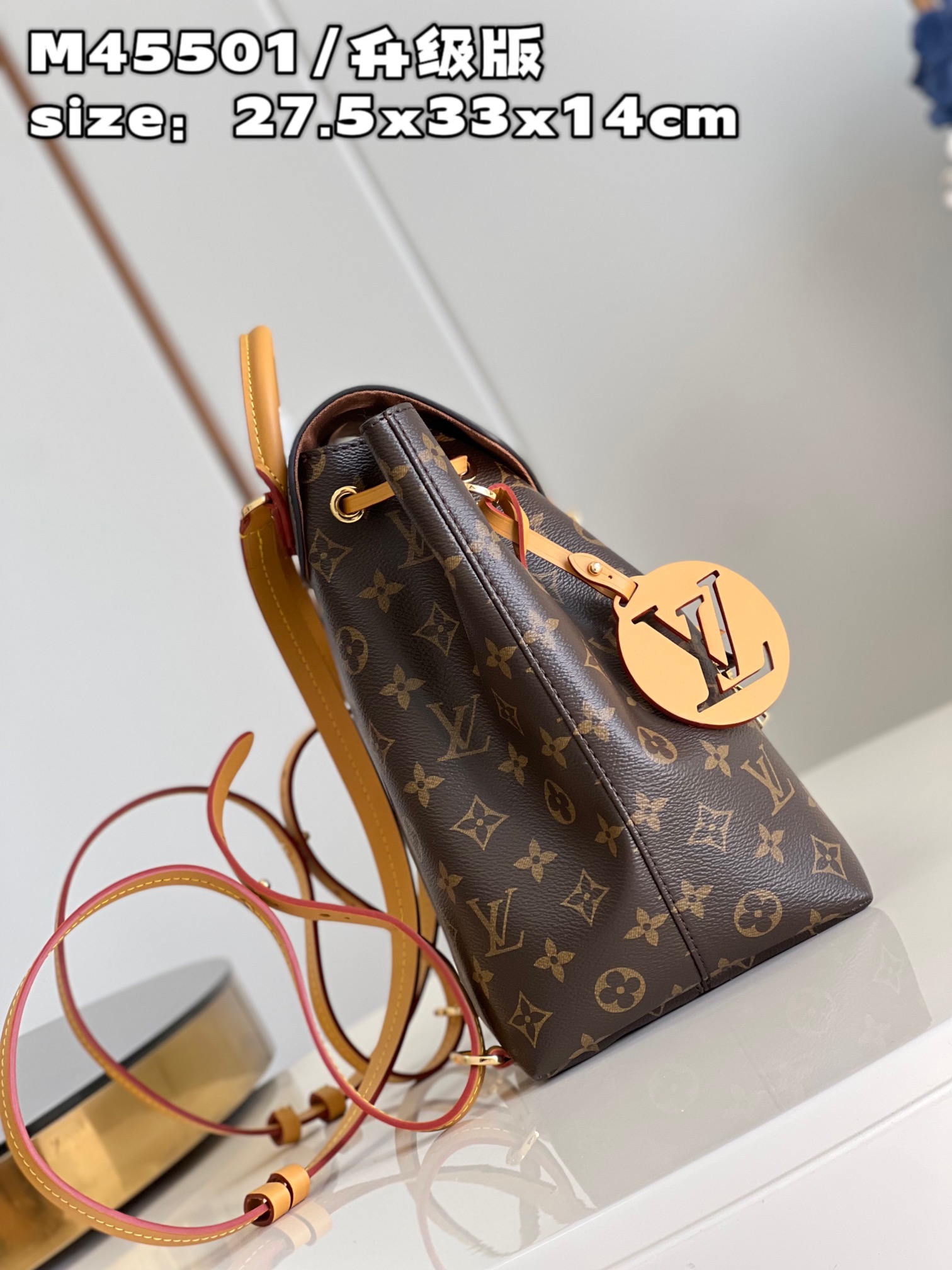 P780 【 Exclusive live shot m45501 upgraded version 】 The new montsouris small backpack is made of Monogram canvas and cow leather, paired with buckle and leather drawstring from the brand's archives. Abundant internal space and zippered outer pocket add functionality, with a top handle and detachable and adjustable leather shoulder straps for multiple carrying methods. Detailed features 27.5 x 33 x 14 cm (length x height x width)
