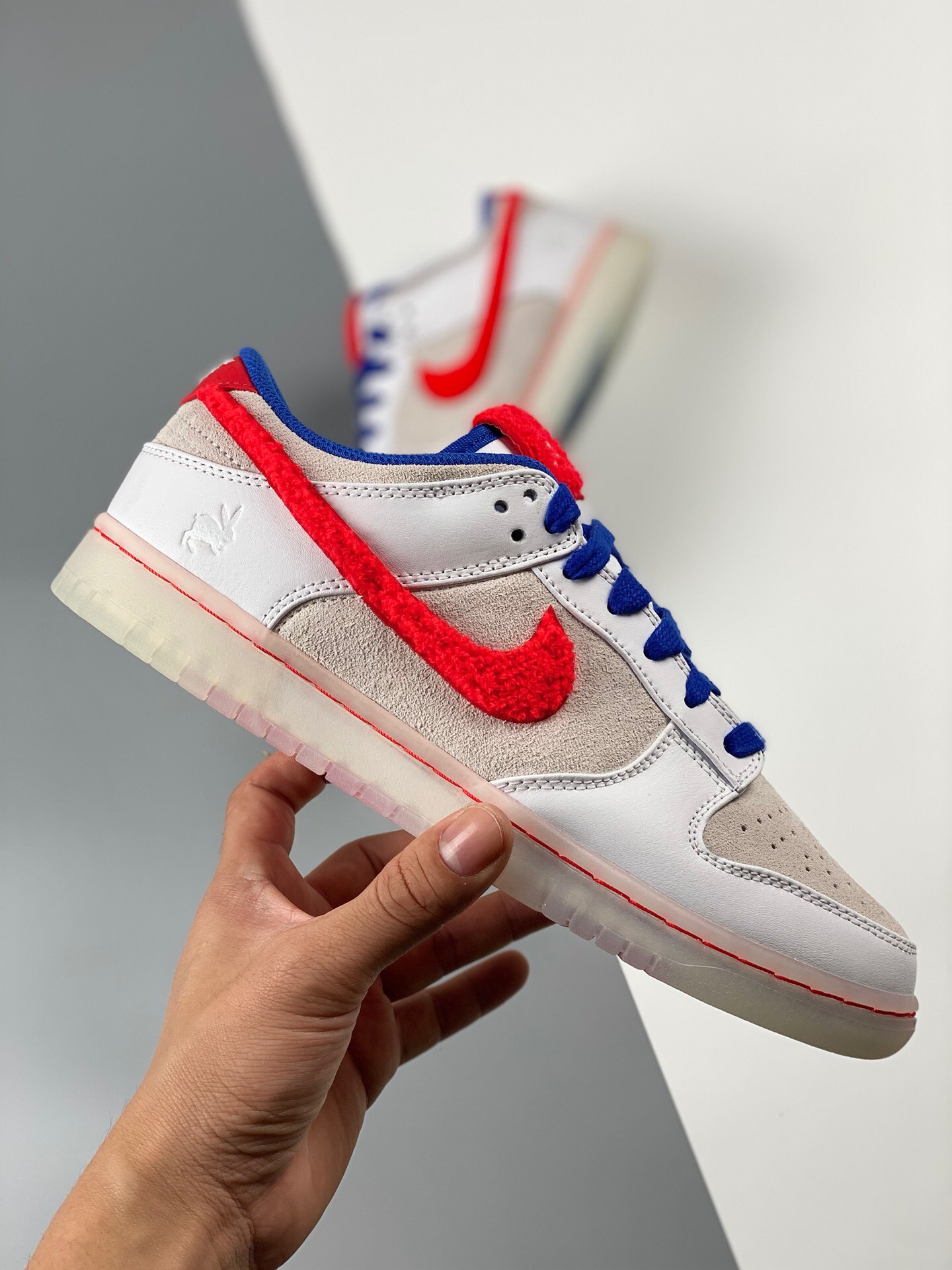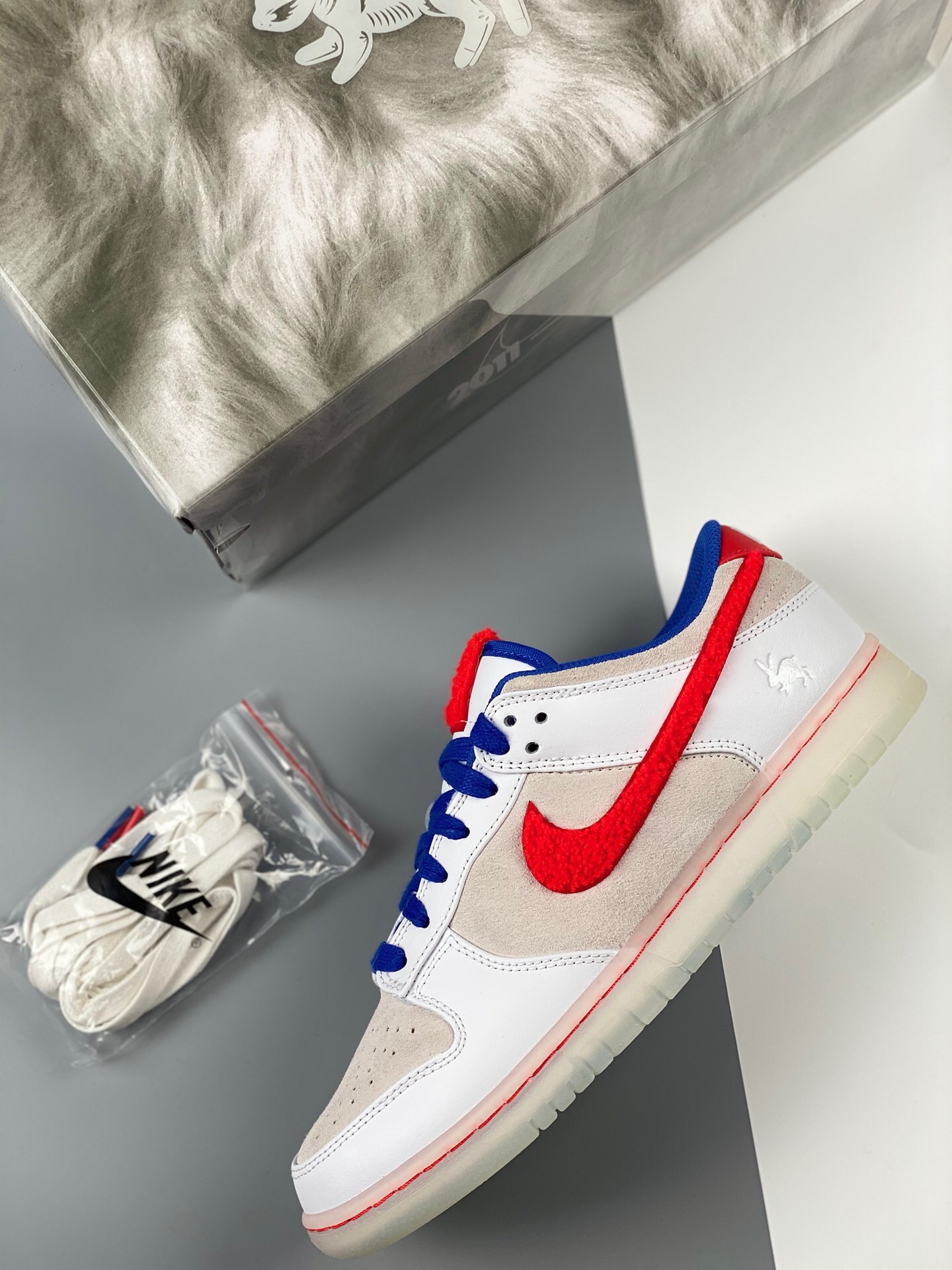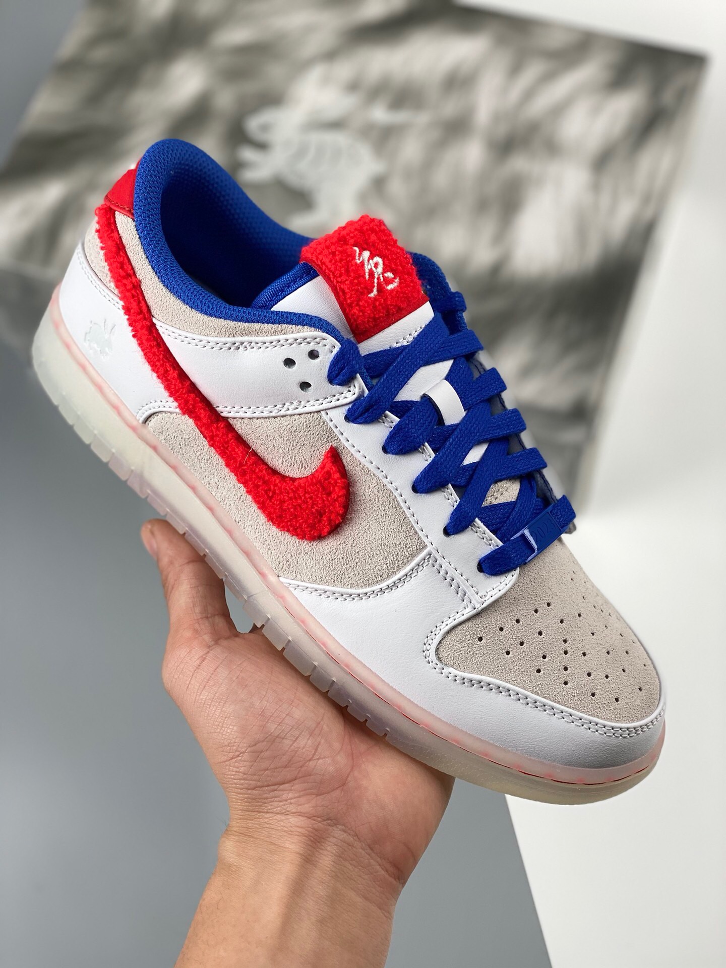 DetailG version nk dunk sb low rabbit year white, red, blue, and white rabbits are produced by the original factory. The first batch of original head layer materials is produced by the original factory. Exclusive version distillation processing brings better visual and foot feeling experience. The factory's pure original quality shipment is clean, and the leather is cut clean without any burrs. Perfect product number: fb7160-161