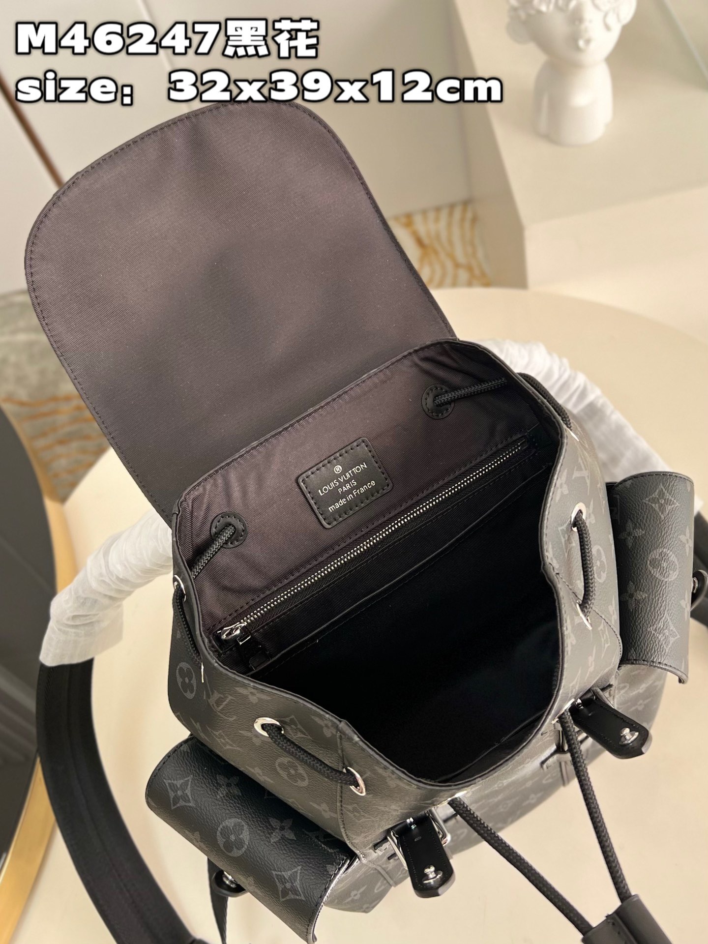 DetailP780 【 Exclusive live shot of M46247 black flower 】 M41379 small This Christopher small backpack combines Monogram eclipse reverse canvas and leather trim, presenting the rough texture of a hiking bag in a slightly smaller size. The side pocket is easy to access and store accompanying items, and a leather flip with a snap closure ensures secure storage. Dimensions: 32 x 39 x 12 cm (length x height x width)