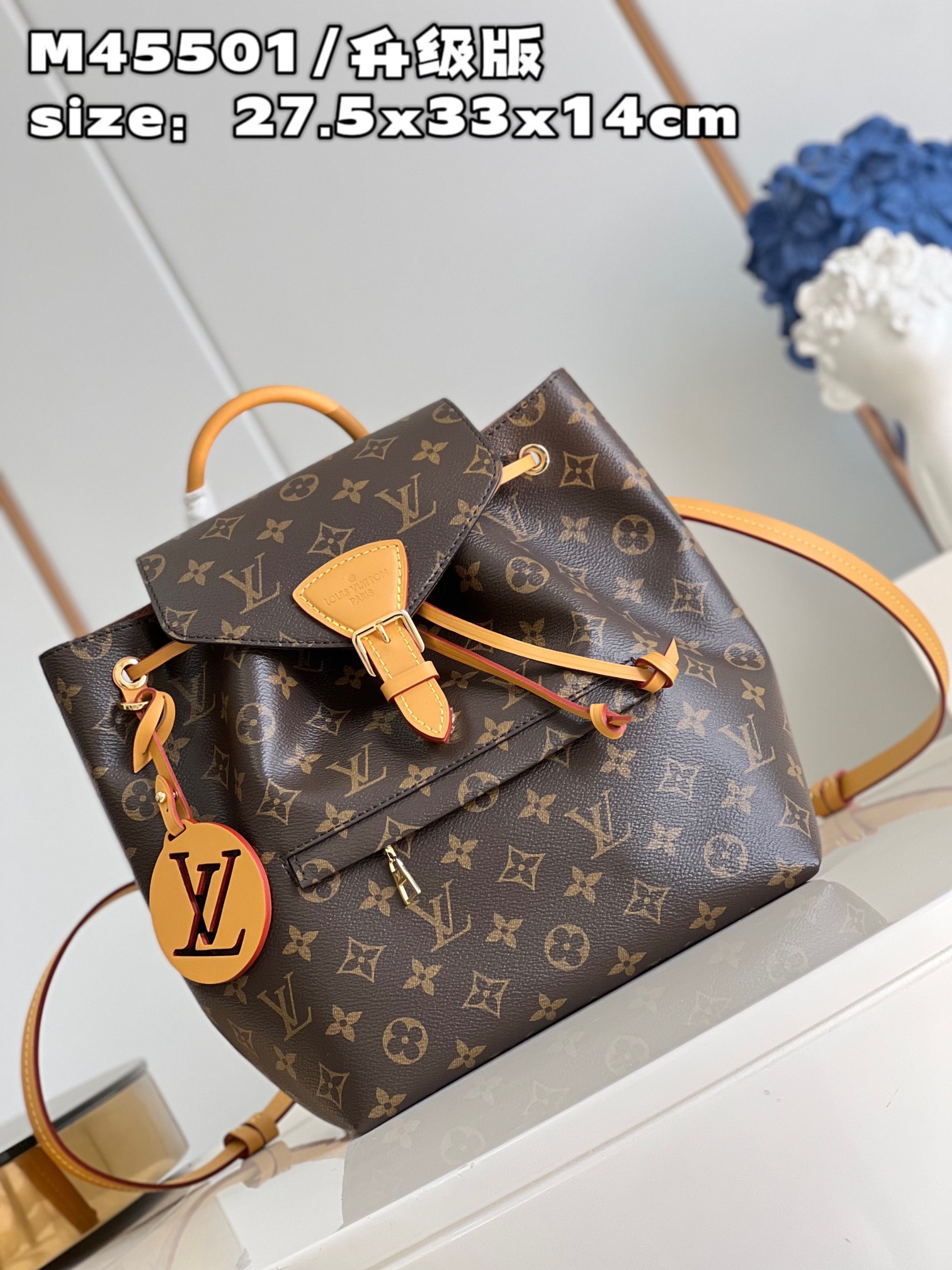 P780 【 Exclusive live shot m45501 upgraded version 】 The new montsouris small backpack is made of Monogram canvas and cow leather, paired with buckle and leather drawstring from the brand's archives. Abundant internal space and zippered outer pocket add functionality, with a top handle and detachable and adjustable leather shoulder straps for multiple carrying methods. Detailed features 27.5 x 33 x 14 cm (length x height x width)